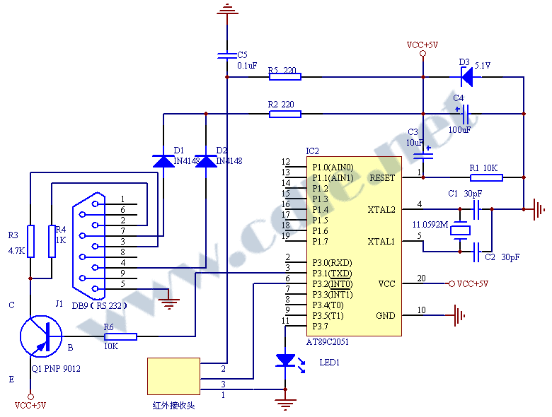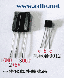 图二中的DB9针串口插座是公头的,也可以用母头的,都没有关系,只是用的连接线不同,无论你使用那种,在焊电路时都要看清引脚的序号(插座上打有序号),搞错了就不好了。图三是元件中的一体化红外遥控接收头和三极管9012的引脚示意图,要注意的是图中的9012的引脚示意图只是我购买到的9012 的引脚极性示意图,可能和你购买到的不同,在装到电路板上时先有万用表测好它的引脚极性,已免意外损坏元件。什么?不会测,那要找找相关的资料学学了,或是让朋友代劳,要不就在买元件时让商家告诉你。收集好元件,我们就可以动手做了。